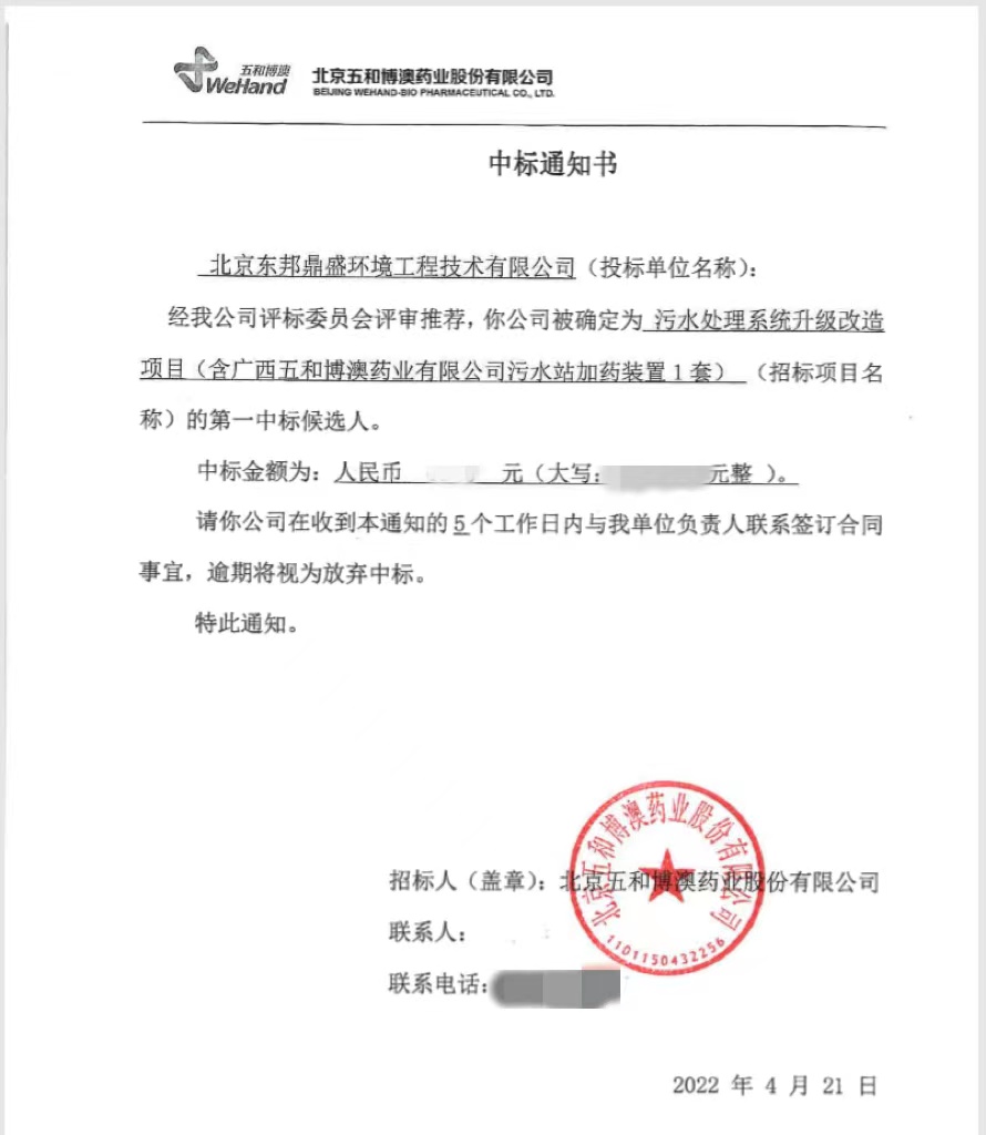 熱烈祝賀北京東邦鼎盛環(huán)境工程技術(shù)有限公司于2022年4月20在《北京五和博澳藥業(yè)股份有限公司-污水處理設(shè)備升級改造項(xiàng)目》公開招標(biāo)活動(dòng)中中標(biāo)!我們本著不求最好,但求更好的原則不斷地創(chuàng)新和改進(jìn),您的意見或建議將是我們不斷努力的源泉!